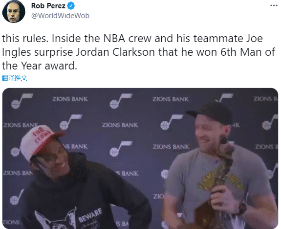 在直播现场,评论员问爵士有多少人获得最佳第六人?克拉克森直言0个,英格尔斯说1个,然后双手指着克拉克森;随后英格尔斯直接把奖杯颁给克拉克森,两人咧嘴大笑都十分开心;英格尔斯调侃:他从我这里偷走了这个奖杯,我不应该再给他传球了。