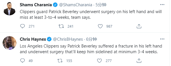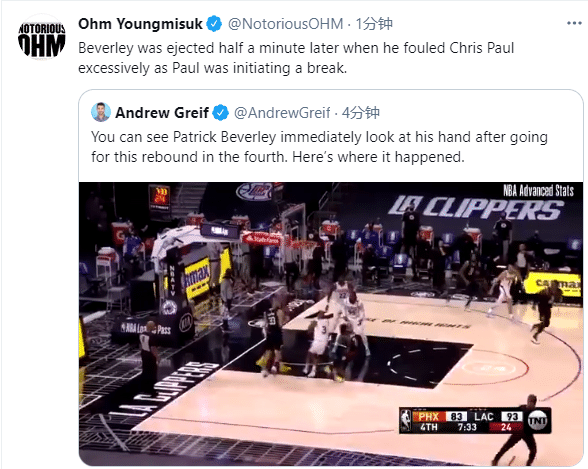 随后快船记者Andrew Grief曝光贝弗利受伤真因,快船和太阳比赛第三节7分30多秒,贝弗利本想抢夺保罗手中的球,球没抢到却受伤了,当时镜头拍到贝弗利抢球后弄伤手掌,也就是在此之后,贝弗利故意恶犯,肘击保罗的裆部吃到二级恶犯,直接被驱逐离场。