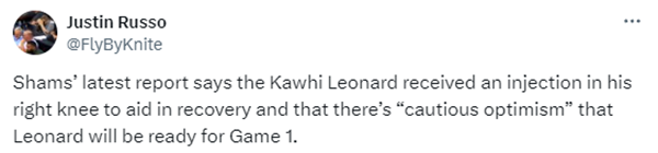 快船队的好消息!小卡计划在首轮G1复出,注射治疗缓解膝盖肿胀