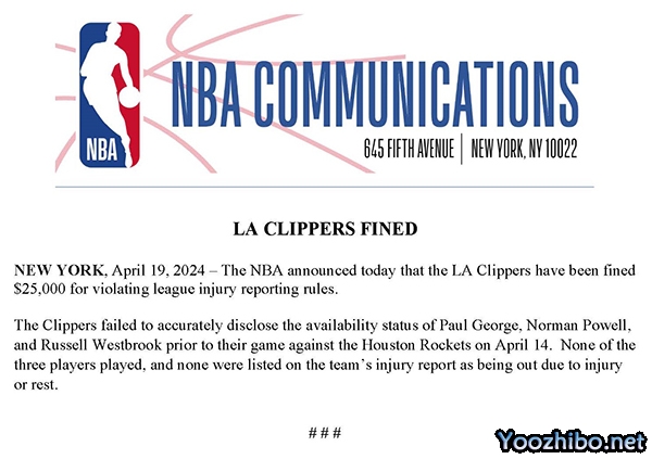 NBA官方发表罚款声明——在4月15日对阵火箭的最后一场常规赛比赛之前,快船没有准确地透露保罗-乔治、诺曼-鲍威尔和威斯布鲁克的出战状态,但这三名球员最终都没有参加比赛,也没有人在球队的伤病报告中被列为因伤缺战或轮休。