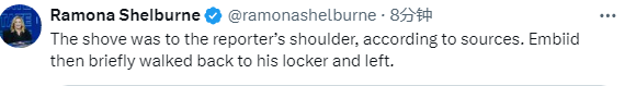 Ramona Shelburne进一步报道,恩比德推了记者的肩膀,冲突之后恩比德暂短走回自己的更衣柜并离开更衣室。