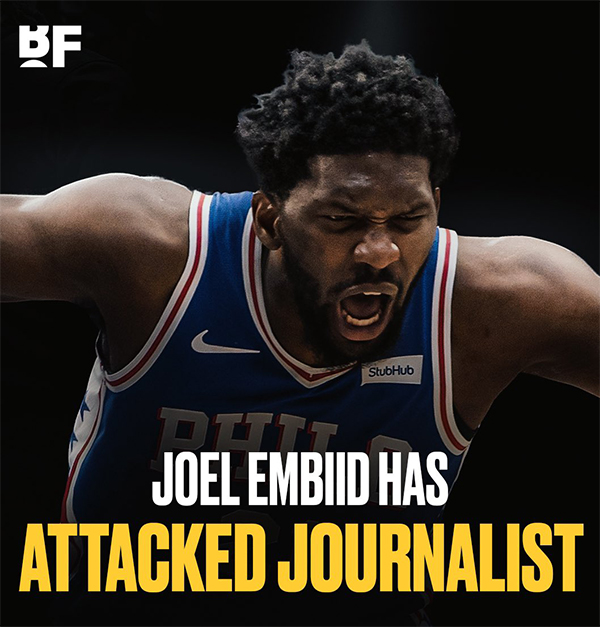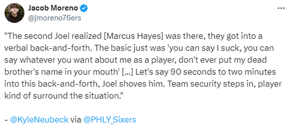 费城记者Jacob Moreno报道,76人输球赛后,当恩比德在更衣室中意识到Marcus Hayes在场时,他们开始争吵起来,恩比德说的话基本就是‘你可以说我烂,你可以随便说我这个球员怎样怎样。但别把我死去的兄弟挂在嘴边,别说我的家人。你可以像男人一样跟我讨论篮球,这跟讨论家人不一样’;双方争吵了90 秒到两分钟后,乔尔推了他一把。球队保安介入,球员们都围了过来。