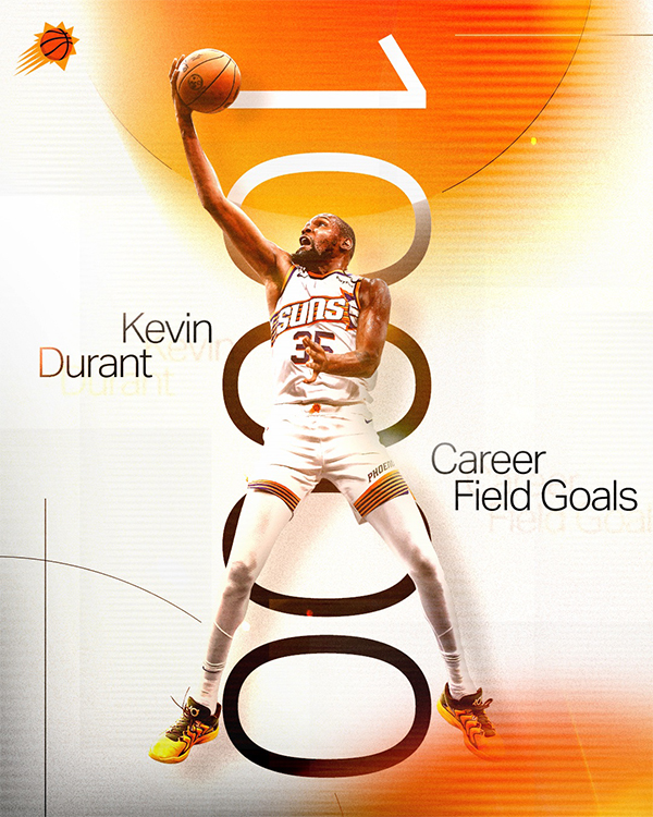 主场对阵开拓者,太阳第一节22-18领先4分,杜兰特的三分失去准星,但招牌中投无人能挡,即使面对两人的补防,KD仍稳稳中投得分;第二节,杜兰特外线开火,打成不讲理3+1以及再中三分,随着本场至少命中三球,杜兰特达成10000球新成就。