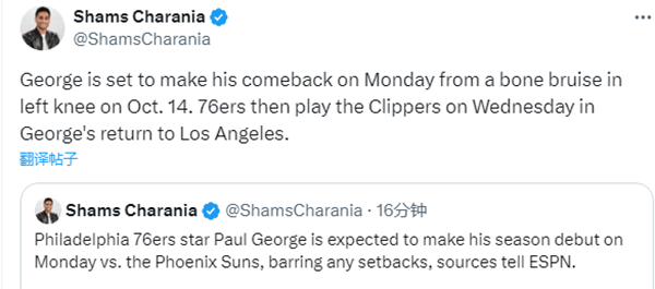 根据赛程,76人将在明天对阵太阳,然后10月7日客场对阵快船;从赛程来看,乔治预计明天复出,然后重返洛杉矶大战旧主快船。