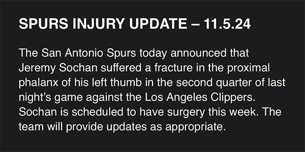 双重打击!马刺波波维奇生病,索汉拇指骨折将手术