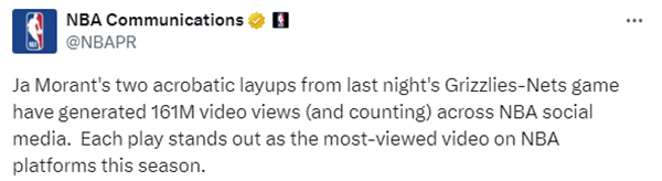 25岁的莫兰特确实天赋异禀,运动能力属于联盟顶级,经常在实战中完成一些不可思议的进球,不愧为当今联盟的腰王;莫兰特的360度上篮刷爆社媒,据NBA官方统计,莫兰特这两次精彩上篮在NBA社交媒体上获得了1.61亿次视频浏览量(并且还在增加),每个动作都是本赛季NBA平台上观看次数最多的视频。