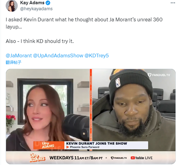 Kay Adams调侃KD说:“你也应该尝试一下这个动作。”