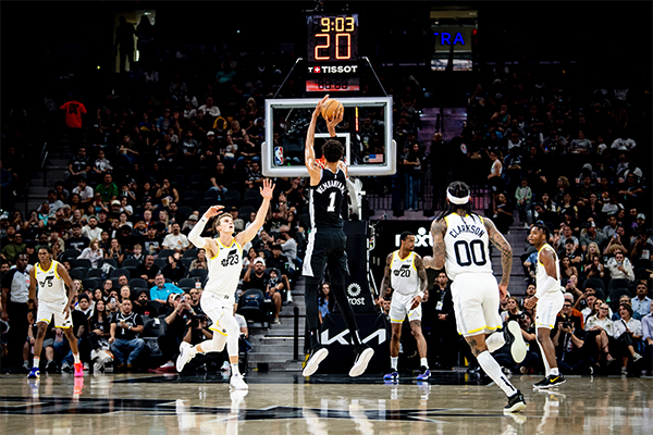 下半场,第三节文班封盖马尔卡宁的三分,并且快速反击上篮,之后借助掩护再中三分;文班下场后马刺轮换阵容继续带队追分,三节打完马刺追到82平,这一节文班3中2拿到5分2篮板并且送出一次大帽。