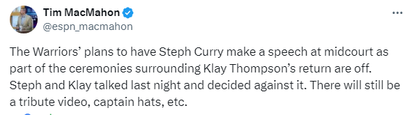 据勇士记者报道,原计划库里会在赛前对球迷发表讲话,欢迎克莱的回归;但是昨天晚上,克莱和库里商量之后,他们两人最终决定取消这个环节,这样大家都能更快地专注于比赛。