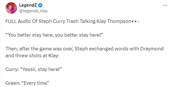 镜头拍到克莱面无表情地坐在替补席,赛后库里拥抱追梦庆祝胜利,并且对追梦说:留在这儿。