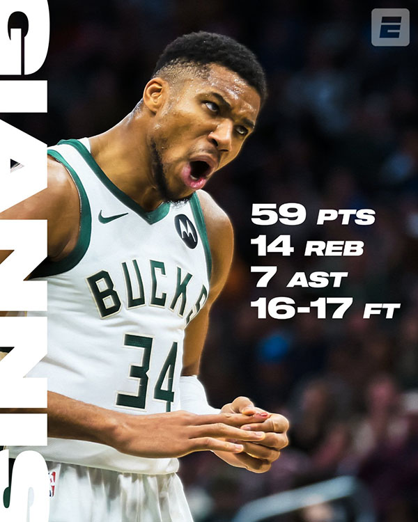 字母哥全场34投21中、罚球17中16狂砍59分14篮板7助攻2抢断3盖帽,除了第二节得分未上双,其他三节以及加时都得分上双,在字母哥的疯狂输出下,雄鹿惊险拿下胜利。