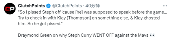 来源:360直播吧11-14 16:06360直播吧讯勇士主场击败独行侠,库里末节关键时刻连得12分接管比赛,亲手搞砸克莱的回家之夜;北京时间11月14日,追梦格林在节目中爆料,库里因克莱的冷漠而生气,我还在中间拱火。