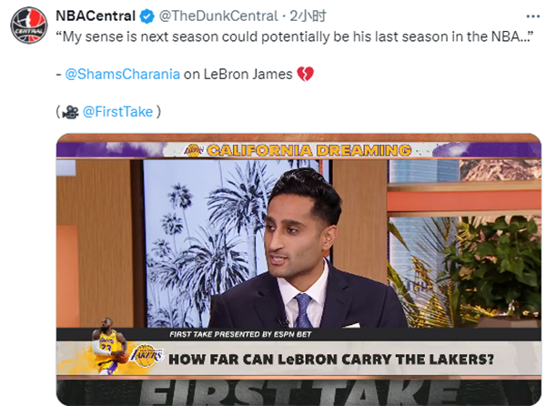 对于詹姆斯何时退役的话题,名记shams在节目中表示:詹姆斯说他不会打到打不动为止,我的感觉是,下个赛季可能是他在NBA的最后一个赛季!你觉得之后他还能再打一个赛季吗,26-27赛季?可能会,布莱斯——他的小儿子,2025届的球员,也许让能让詹姆斯再坚持一两年,但我觉得下赛季在洛杉矶举行的全明星赛中,会给大家留下一些美好的回忆。
