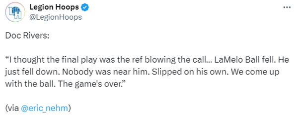 赛后谈到三球摔倒造犯规的决胜判罚,雄鹿主帅里弗斯表示:我认为最后一攻是裁判的错误判罚,已经连续两场比赛最时刻出现错误判罚了,拉梅洛-鲍尔摔倒了,他只是自己摔倒了,没人在他附近,他自己滑倒了,我们如果抢到了球,比赛就结束了。