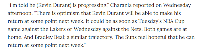 名记shams在节目中谈到了杜兰特的恢复情况,他表示:杜兰特自从11月8日起因小腿拉伤缺阵,我被告知,他在取得恢复进展,他会缺席今晚的比赛,但是对于杜兰特将在下周的某个时候回归存在乐观预期,最早可能在周三对阵湖人的杯赛中回归,或者周四对阵篮网的比赛。这两场比赛都在主场。布拉德利-比尔的前景也差不多,太阳希望比尔能在下周复出,他也在应对小腿拉伤。