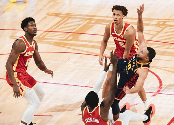 第二节勇士替补阵容带领球队继续压制老鹰,库里上场后输送三分,面对老鹰的反扑,库里空切轻松上篮,造犯规两罚球全中,维金斯接连打进三球续上火力,上半场最后2分33秒,勇士一波10-0太狠,半场打完勇士67-42领先25分。
