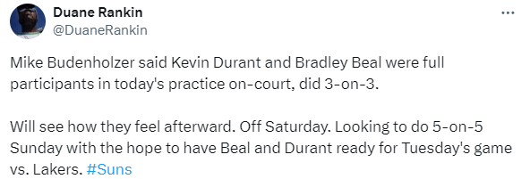 太阳双巨杜兰特、比尔已对抗训练,下周三能否出战湖人?