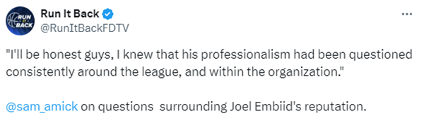 名记Sam Amick在节目中谈到了恩比德,他表示人们已经对恩比德的职业道德产生了担忧,不仅是在联盟里,包括76人内部,但暂时还不清楚人们的质疑到了什么程度以及实际情况怎样。