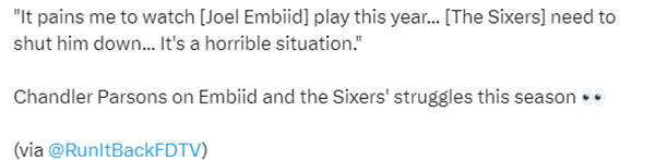 近日,帕森斯曾在节目中批评恩比德,他表示:看恩比德打球让我感到痛苦,我知道他现在不对劲,他不健康;他们需要让他赛季报销。我知道如果这样做的话他会被媒体骂死,但这没关系。(如果你非要继续打)你只是在浪费你的一年,你只会毁掉球队明年的选秀权。这是一个非常非常可怕的情况,我为恩比德感到难过。