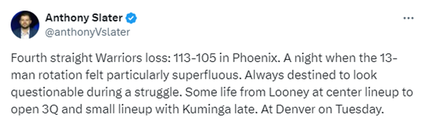 科尔13人轮换引争议,赛后勇士队记Anthony Slater发文点评道:败走凤凰城,苦吞四连败。在这个夜晚,13人轮换显得尤为多余。在苦苦挣扎中,这一安排注定会暴露问题。卢尼在下半场首发、和随后库明加的小阵容都发挥了一定作用。下一场,下周二,要打掘金了。