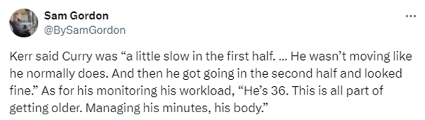 赛后,勇士主帅科尔谈到库里的表现,科尔说道:他上半场有点慢热,他不像平时那样移动。不过他在下半场找到了状态,并且看起来很好。他现在36岁了,这都是变老的一部分,要管理好他的出场时间和身体。