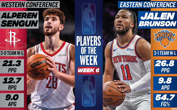 周最佳荣耀归属:火箭申京与尼克斯布伦森强势当选,众星陪跑提名