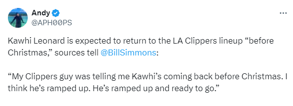 据名嘴Bill Simmons报道,小卡将在圣诞节前复出,报道称:我的快船小伙伴告诉我,莱昂纳德会在圣诞节之前回归,我想他已经在加速了,他已经准备好了。