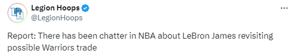 众所周知,在去年交易截止前,勇士曾向湖人询价关于詹姆斯的交易,最终詹姆斯和湖人都拒绝谈判;今年休赛期,詹姆斯和湖人续签2年1.04亿美元的大合同,拥有球员选项和交易否决权。