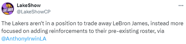 Anthony Irwin报道称,消息人士透露,与过去几年的情况一样,至少在本赛季剩下的时间里,湖人队不会认真考虑交易詹姆斯,佩林卡和管理层正专注于改善阵容,首要任务是引援中锋补强内线。