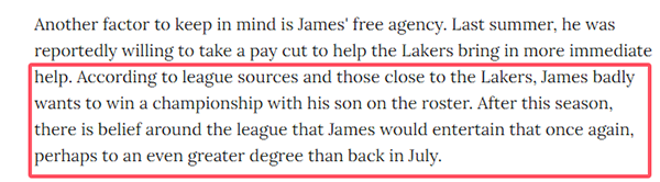 另外消息人士透露,詹姆斯非常想和布朗尼一起赢得总冠军;今年休赛期,詹姆斯降薪续约,帮助湖人更好地引援;本赛季结束后,联盟中有人相信詹姆斯会再次接受降薪,可能比今年7月份的降薪幅度更大。