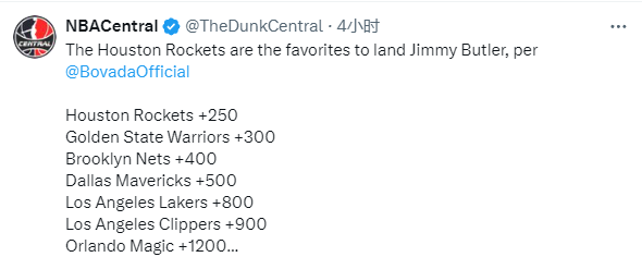 热火兜售巴特勒引热议,他的最新下家赔率出炉,火箭居首,勇士第2湖人第5,具体赔率——1、火箭 +250;2、勇士 +300;3、篮网 +400;4、独行侠 +500;5、湖人 +800;6、快船 +900;7、魔术 +1200;8、鹈鹕 、灰熊和国王+1600;骑士 +2000。