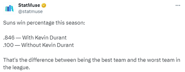 本赛季至今,杜兰特出战时太阳11胜2负,胜率高达84.6%;杜兰特因伤缺战时,太阳10战仅仅拿到1胜9负的糟糕战绩,胜率只有可怜的10%,美媒调侃:这就是联盟中最好的球队和最差的球队之间的区别。