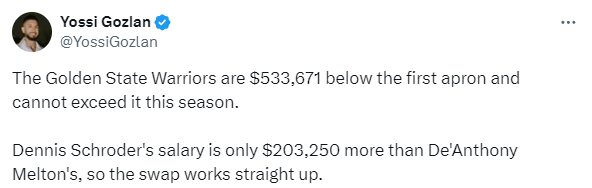 据薪资专家Yossi Gozlan报道,勇士队总薪资距离硬工资帽仅仅只差533671美元,施罗德的薪资比梅尔顿多203250美元,因此这笔交易可以直接达成。