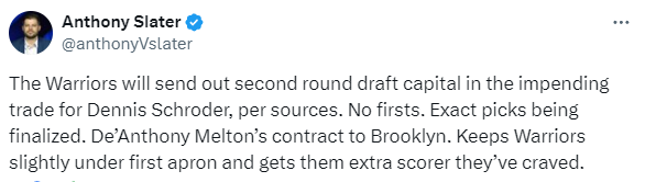 由于梅尔顿遭遇十字韧带撕裂的重伤并且因伤确定赛季报销,勇士开始想办法交易梅尔顿,施罗德、库兹马、卡梅隆-约翰逊等人成为勇士的潜在引援目标,如今勇士捷足先登,率先通过交易引援施罗德。