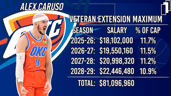 据名记Shams报道,卡鲁索的经纪人透露,卡鲁索已经同意和雷霆达成4年8100万美元的续约合同,这是卡鲁索在雷霆能拿到的最大续约合同;这笔续约使得卡鲁索无法在明夏成为自由球员,他的合同将持续到2028-29赛季。