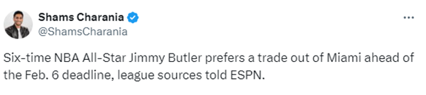 名记shams撰文报道,吉米-巴特勒希望在2月7日交易截止日前被交易,离开迈阿密热火;ESPN在12月11日的《Inside Pass》中报道,热火愿意听取关于巴特勒的交易报价,而巴特勒也希望能在交易中加盟一支有争冠实力的球队。消息人士称,巴特勒尚未正式向热火提出交易请求,但外界普遍认为他已做好离队准备。