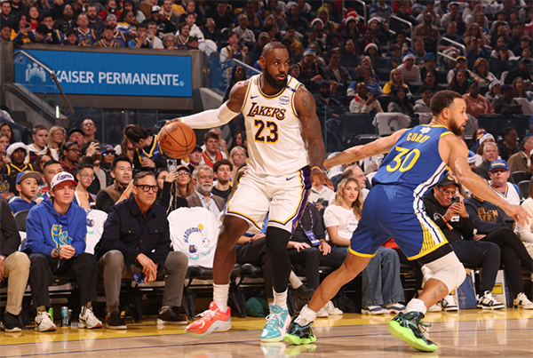 上半场,詹姆斯13投7中拿到19分3篮板3助攻,库里则是11投6中、三分8中4拿到16分4助攻,老詹和库里次节都是单节独砍11分,他们在大通中心疯狂对飚点燃年终大战。