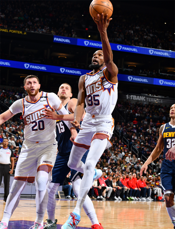 下半场,太阳第三节在攻防两端都压制掘金,单节27-22赢5分,这一节掘金全队出现多达6次失误,比尔抢断反击以及禁区大帽布劳恩太强硬;这一节杜兰特贡献9分,约基奇5分5篮板0助攻。