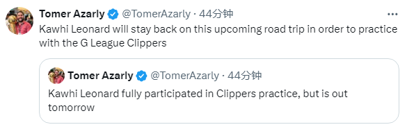泰伦-卢透露,小卡今天成功参加了一次5V5训练,不过他明天不会参赛,他需要打更多的5V5才能够复出;卢指导还表示小卡将不会随队出征接下来的三连客,他将留在圣地亚哥与快船G联赛球队一起训练。