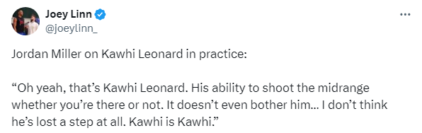 究竟小卡现在的状态如何?快船球员乔丹-米勒表示:那就是莱昂纳德。不管你防不防,他都有中距离投篮的能力。这一点都不困扰他,我不认为他有任何退步,卡哇伊就是卡哇伊。