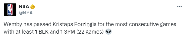 据统计,文班亚马已经连续65场至少送出1次盖帽,连续22场至少1次盖帽且命中1记三分超越波尔津吉斯创联盟新高。