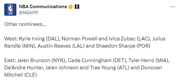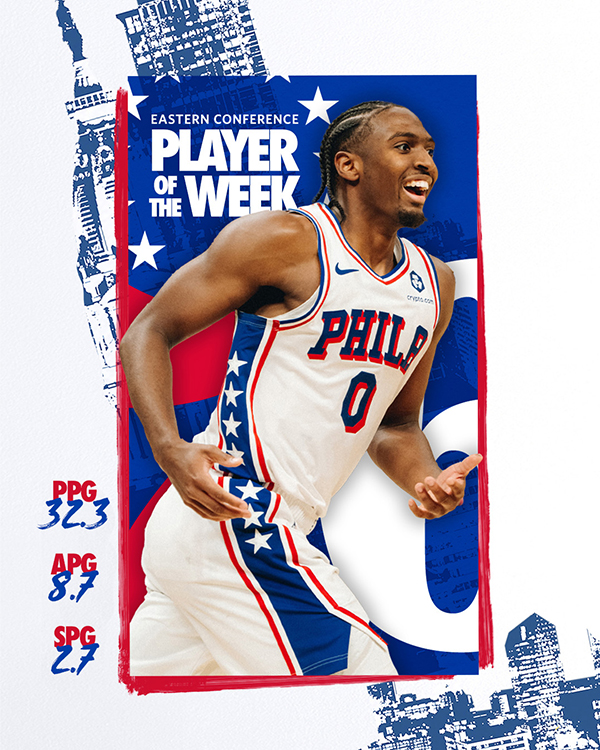 来源:360直播吧12-31 18:18360直播吧讯北京时间12月31日,NBA官方公布本赛季第10周东西部周最佳球员,76人球星马克西和雷霆球星亚历山大当选,两人都是场均30+当选,欧文、布伦森、里夫斯等人获提名。