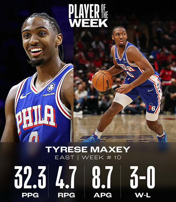 马克西赛季首次当选东部周最佳,生涯第二次当选周最佳,上一次获得周最佳是2023年10月10日;76人官方晒海报祝贺马克西。
