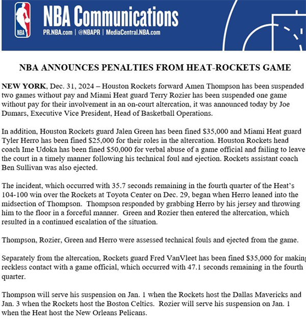 官宣!火箭与热火冲突罚单:阿门禁赛两场,两队将帅4人荷包受损