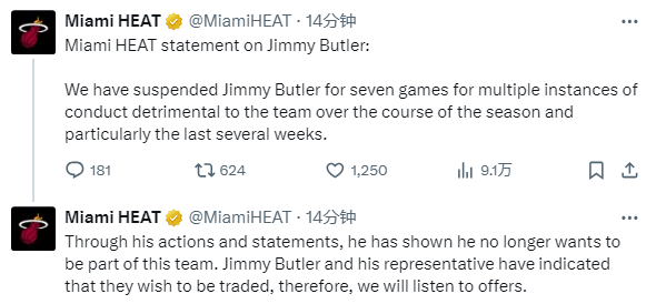 热火官方声明:吉米·巴特勒因在本赛季,尤其是过去几周的多次对球队的不利行为,我们已对他实施了7场禁赛。他的行为和言论表明,他不想再成为这支球队的一员。吉米·巴特勒和他的代表表示,他们希望被交易,因此,我们将听取报价。