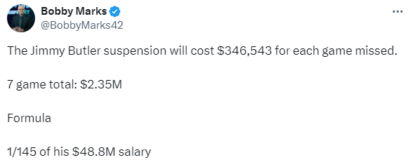 巴特勒被禁赛7场,NBA薪资专家Bobby Marks跟进曝光,根据劳资协议,巴特勒每场比赛将损失1/145的年薪,也就是每场损失346543美元,7场合计损失总额235万美元。