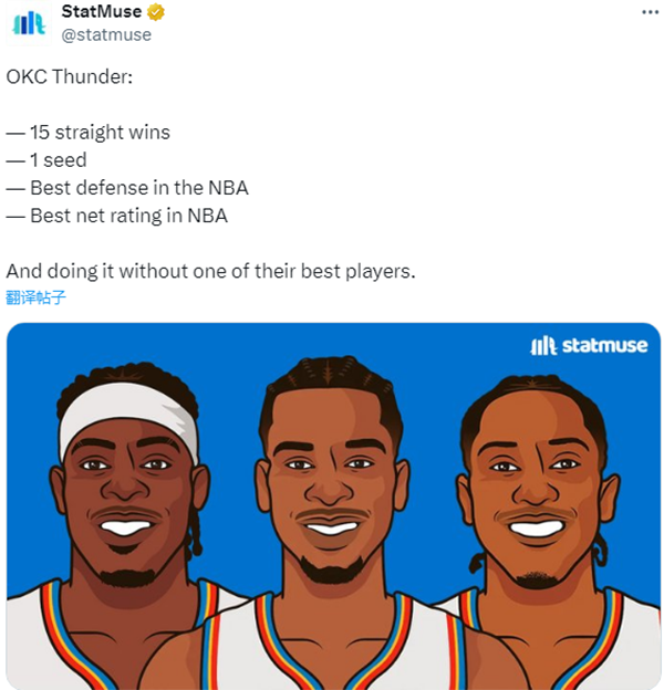 雷霆15连胜稳坐西部第一,本赛季防守效率联盟第一,净效率也是联盟第一,而且雷霆是在切特-霍姆格伦伤停的情况下打出这样的出色表现。