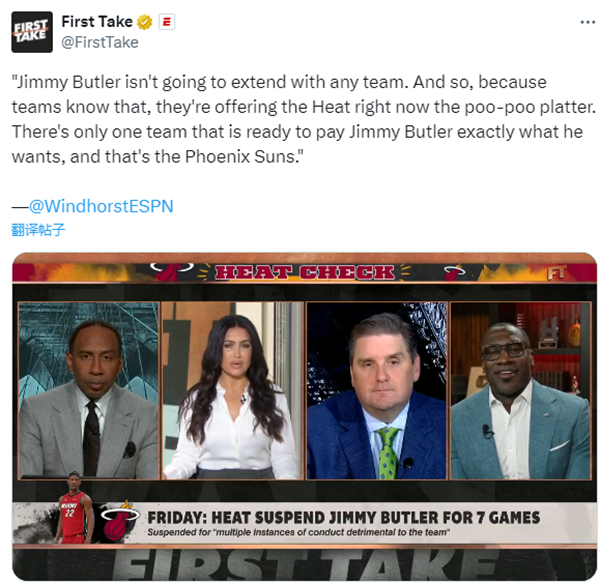 Evan Sidery报道,太阳和巴特勒互相之间都有很大的兴趣;交易截止日之前,巴特勒最理想的结果就是加盟菲尼克斯,而太阳也明确表示,他们愿意为巴特勒的新合同支付他想要的金额。