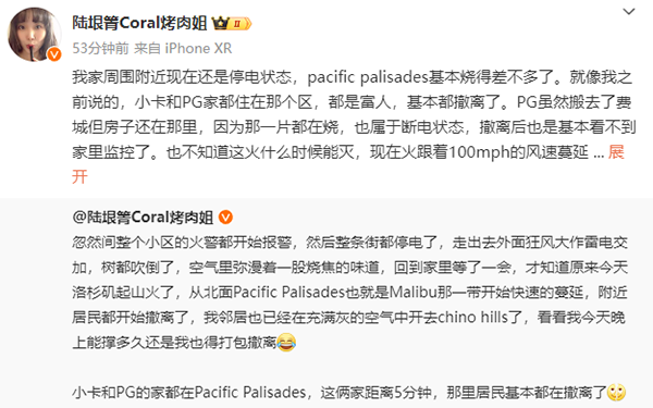 今日烤肉姐更新动态写道:我家周围附近现在还是停电状态,Pacific Palisades基本烧得差不多了。就像我之前说的,小卡和PG家都住在那个区,都是富人,基本都撤离了。PG虽然搬去了费城但房子还在那里,因为那一片都在烧,也属于断电状态,撤离后也是基本看不到家里监控了。也不知道这火什么时候能灭,现在火跟着100mph的风速蔓延能做到不扩散都不容易。2025一开始好多灾多难……