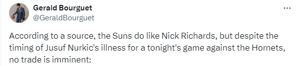 太阳跟队记者Gerald Bourgue报道,太阳确实很喜欢黄蜂球员理查兹,他们正在考虑如何交易得到这位27岁的大个子球员,太阳迫切想要升级中锋轮换,增加身高、运动能力、跑位和篮下终结能力,据知情人士透露,努尔基奇患了流感,理查兹的交易似乎不会马上发生。